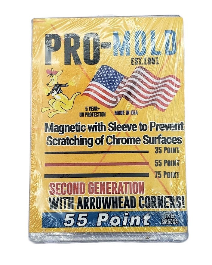 The PRO-MOLD 2nd Gen 55 pt Magnetic Trading Card Holder is a premium, two-piece magnetic case designed for securely protecting standard-sized trading cards up to 55-point thickness. Made from high-clarity, archival-safe materials, this holder is free of PVC and acid, ensuring long-term preservation without damaging the card. Its Magnetic design allows collectors to easily open and close the case without tools, while still providing a firm, tamper-resistant seal. The 2nd generation design includes refined edges and improved clarity for better display and stacking. Ideal for sports cards, Pokémon, Magic: The Gathering, and other valuable collectibles, this holder combines durability, functionality, and display-ready quality trusted by serious collectors.