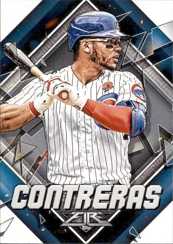 The design of the 2022 Topps Willson Contreras card emphasizes motion and energy, focusing on the player’s form and expression. Contreras is depicted in a powerful pose, capturing the essence of his dynamic presence on the field. His determined look and action-packed stance convey the energy of the game, while the vibrant background seems to echo the intensity of a fast-paced baseball game. The modern artistic elements in the background, combined with the smooth, glossy finish of the card, create a visually striking effect that enhances the card’s overall appeal. This artistic flair makes the Topps Fire series distinct from other sets, allowing it to stand out in both a collector’s collection and in any display. The card not only celebrates Contreras’ physical prowess but also encapsulates the excitement he brings to the game.