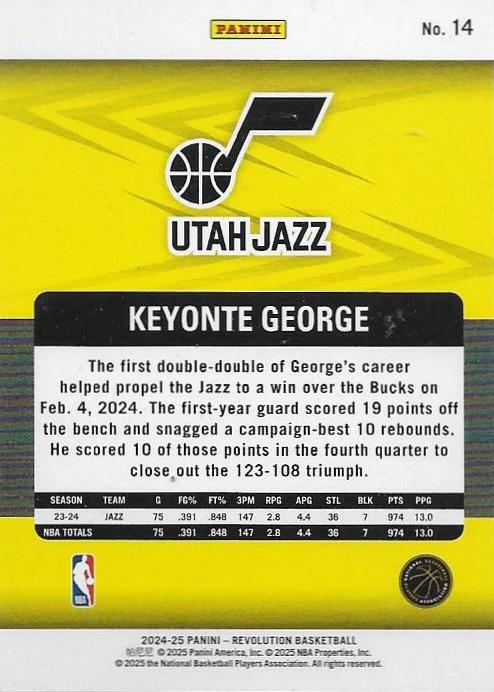 The 2024‑25 Panini Revolution #14 Keyonte George – Utah Jazz base card features the young guard slicing through the court with confident determination—captured mid-dribble or launching a perimeter jumper—while wearing the Jazz’s bold navy, green, and gold. As card number 14 in the set, it adheres to Revolution’s eye-catching, futuristic aesthetic: holographic swirl patterns and multi-layered foil coatings ripple around George, enhancing his fluid movement and offensive versatility. The vibrant design merges the team’s color palette with dynamic optical effects that echo his agility and smooth scoring skills.