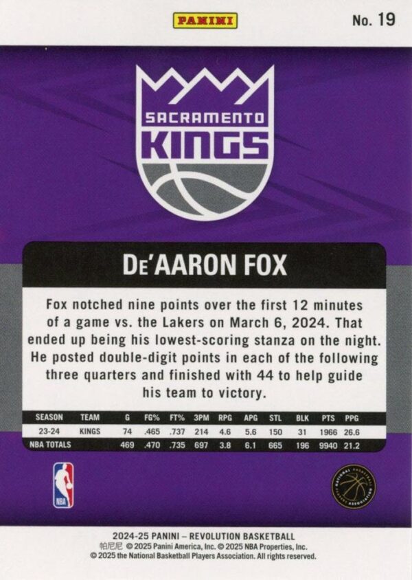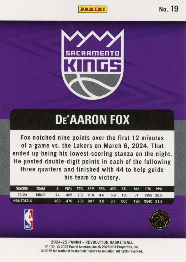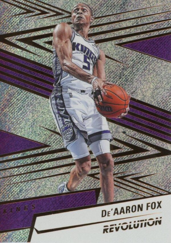 The 2024-25 Panini Revolution #19 De’Aaron Fox card captures the electrifying speed and competitive fire of the Sacramento Kings’ star point guard. Showcasing Fox in a high-octane moment, the card is elevated by the signature Revolution design—featuring energetic swirl patterns, bold team colors, and radiant foil accents that mirror the intensity he brings to the court. The sharp photography and dynamic background create a sense of motion and urgency, perfectly reflecting Fox’s fast-paced playing style. It’s a visually compelling piece that stands out in any modern basketball card collection.