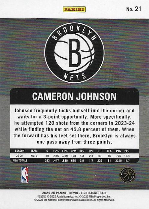 The 2024-25 Panini Revolution #21 Cameron Johnson card showcases the Nets’ versatile forward and reliable shooter.