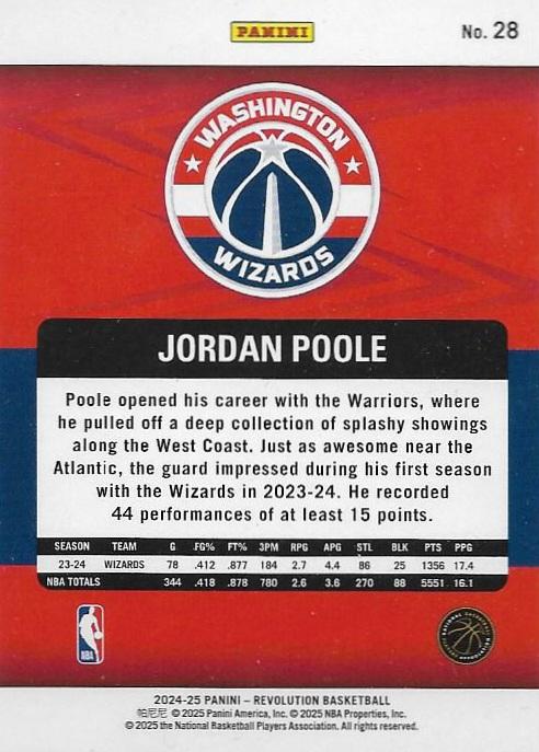This 2024-25 Panini Revolution card features the brand’s signature vibrant design with bold graphics and premium card stock. The Revolution set continues to appeal to collectors with its modern aesthetic and dynamic visual elements that complement the Wizards’ red, white, and blue color scheme.