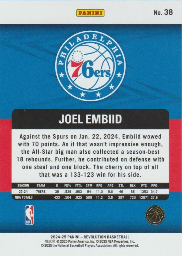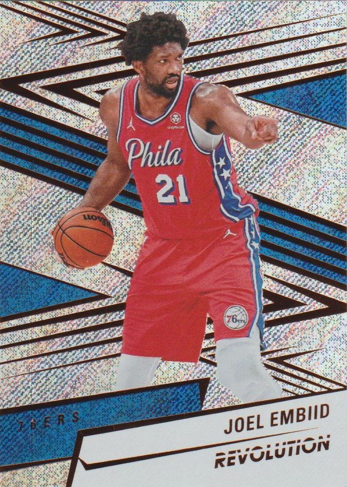The 2024-25 Panini Revolution design features the brand’s signature clean aesthetic with vibrant team colors and sharp action photography, capturing Embiid in his 76ers uniform. Revolution continues to deliver visually appealing base cards that balance modern design elements with classic basketball card appeal, making this an essential addition for team set builders and fans of elite NBA talent.