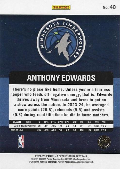 This 2024-25 Panini Revolution release features the brand’s signature bold design aesthetic with vibrant colors and premium cardstock, capturing Edwards in action wearing his Timberwolves jersey. The Revolution series continues to deliver visually striking cards with strong collector appeal, making this base card a standout piece for any basketball card collection.