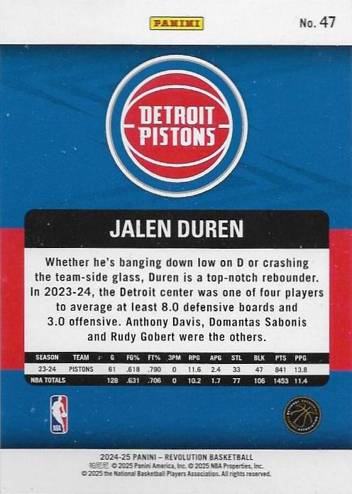 The 2024-25 Panini Revolution series continues its reputation for bold, contemporary design with vibrant colors and striking geometric patterns that create visual impact. This Duren card features the signature Revolution aesthetic with dynamic photography capturing the young center in Pistons red, blue, and white. The premium cardstock and modern design elements make this card stand out in any collection, particularly appealing to collectors who appreciate the Revolution brand’s commitment to eye-catching presentation and quality construction.