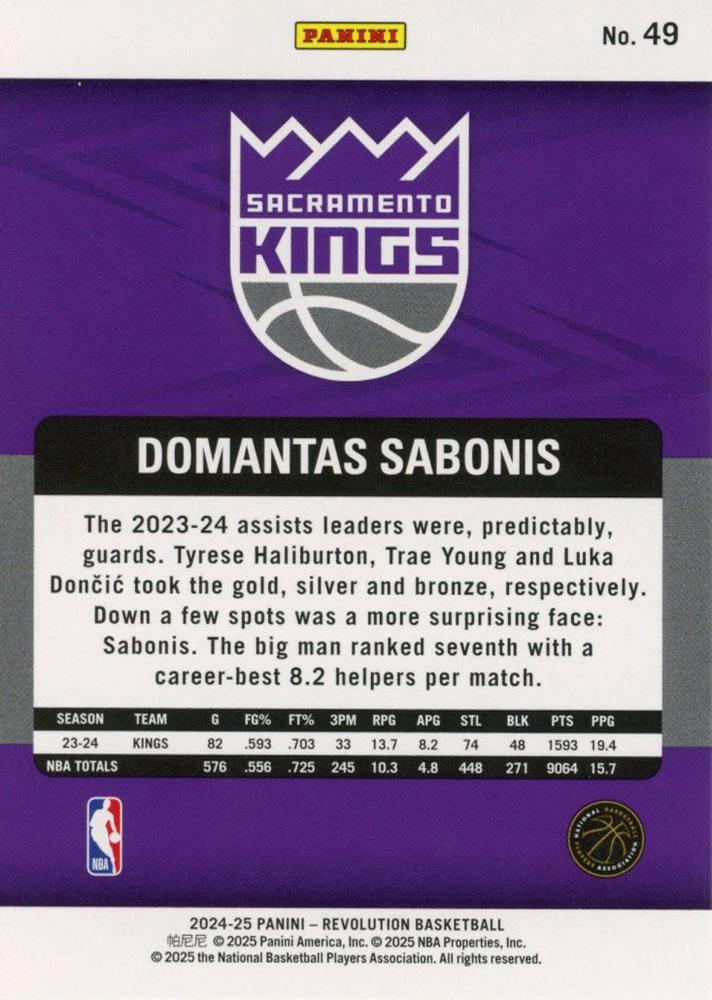 The 2024-25 Panini Revolution #49 Domantas Sabonis card showcases the dominant center during another outstanding campaign with the Kings.