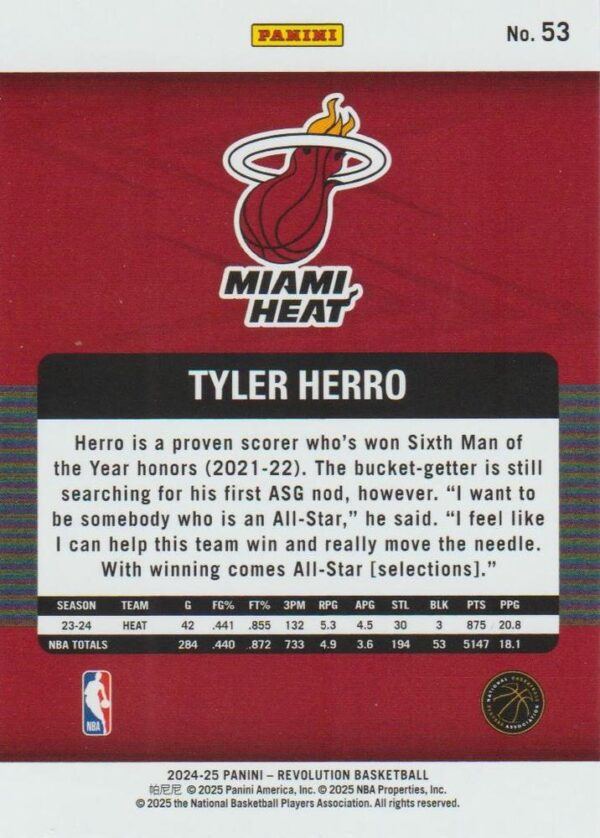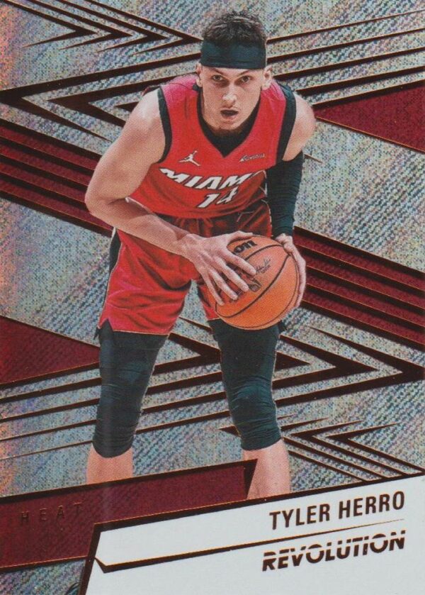 Panini Revolution delivers its signature modern aesthetic with prismatic foil elements and vibrant team colors that make cards pop under light. The set’s contemporary design philosophy captures the energy and excitement of today’s NBA stars like Herro. Revolution cards are highly regarded among collectors for their visual appeal and quality photography that showcases players in action, making this a standout piece for Heat team collectors or fans of elite shooting guards.
