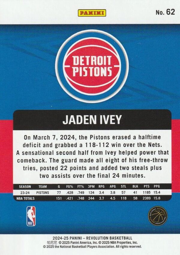 The 2024-25 Panini Revolution set continues to deliver its signature bold aesthetic with vibrant color schemes and dynamic action photography that captures the intensity of NBA gameplay. Revolution has built a strong reputation among collectors for producing visually striking base cards with modern design elements, making this Ivey card an attractive addition for team set completists and fans of athletic young guards.