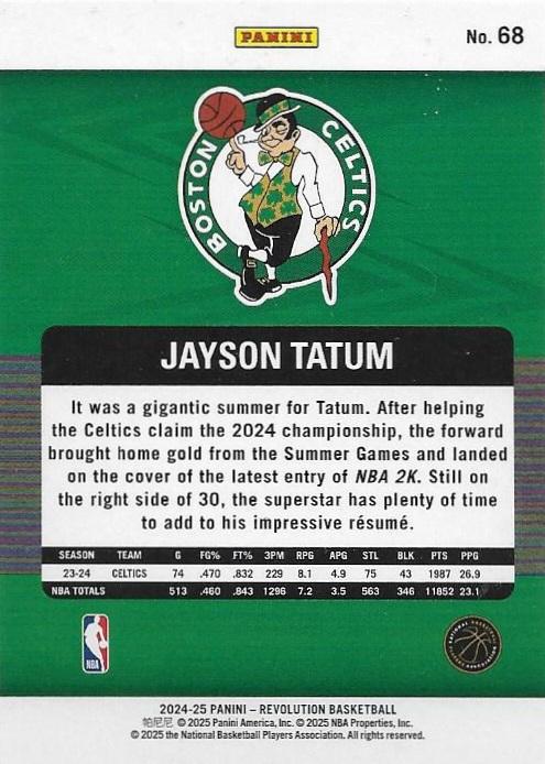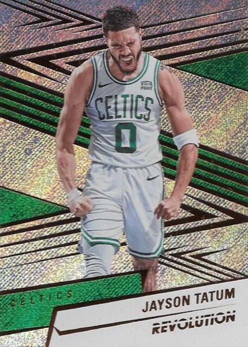 The 2024-25 Panini Revolution set features modern design elements with clean photography that captures players in game action. Revolution has built a reputation for delivering quality base cards with appealing aesthetics, making this Tatum card a strong choice for team set builders and fans of contemporary NBA stars.