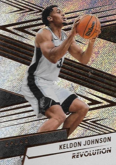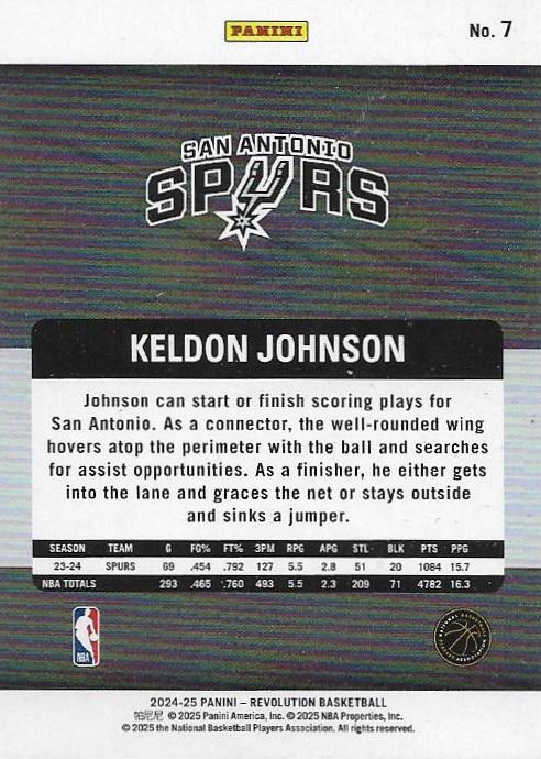 The 2024‑25 Panini Revolution #7 – Keldon Johnson – San Antonio Spurs base card places Keldon in a poised, athletic stance—whether he’s charging to the rim or spotting up for a mid-range pull-up. Set against the series’ swirling, cosmic foil backdrop and layered holographic textures, the card captures the pace and intensity of Johnson’s game. As the seventh entry in the Revolution set, it ushers in the Spurs segment with clean design and bold visual energy that complements the team’s black-and-silver palette.