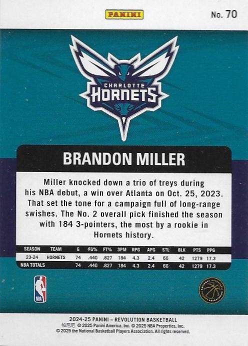 2024-25 Panini Revolution #70 – Brandon Miller (Charlotte Hornets, SF)
