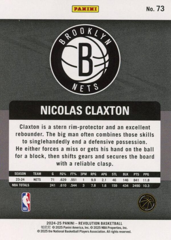 The 2024-25 Panini Revolution #73 Nicolas Claxton card features the Brooklyn Nets’ defensive anchor at center.