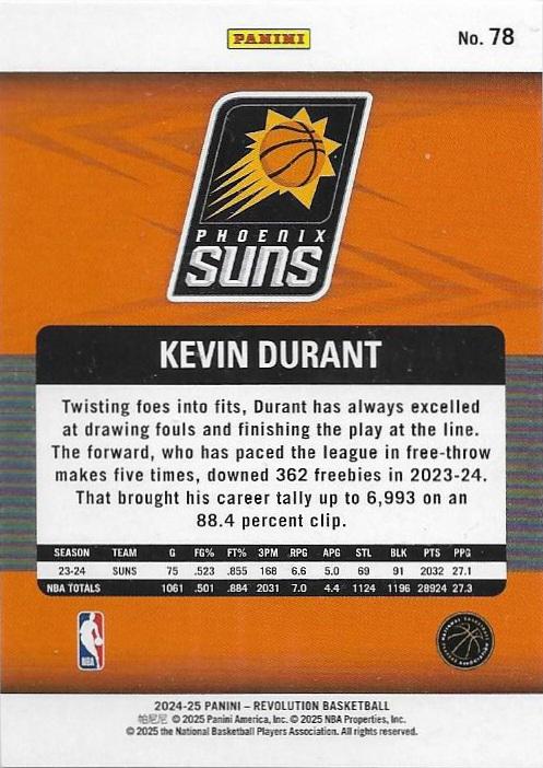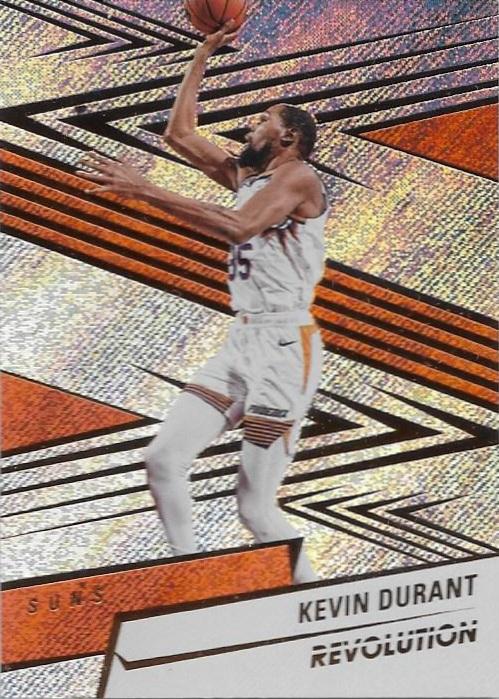 Revolution Basketball‘s signature prismatic foil design and eye-catching technology make this Durant card a standout addition to any collection. The set’s distinctive bright foil backgrounds and modern aesthetic perfectly complement Durant’s star power, creating a premium collectible that captures one of the NBA’s most iconic players in his Phoenix uniform.