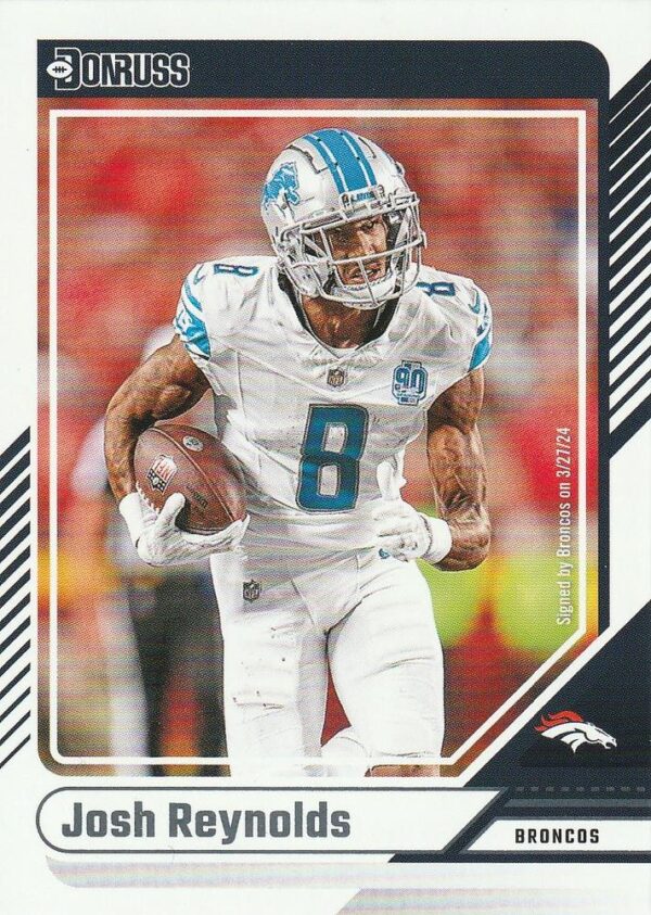 The 2024 Donruss #294 Josh Reynolds card marks a new chapter in the career of this dependable wide receiver, now suiting up for the Denver Broncos. Reynolds has built a solid reputation as a reliable target with great field awareness, clean routes, and the ability to make contested catches. As he joins Denver’s offensive unit, Reynolds is expected to bring veteran leadership and add depth to a developing receiving group.