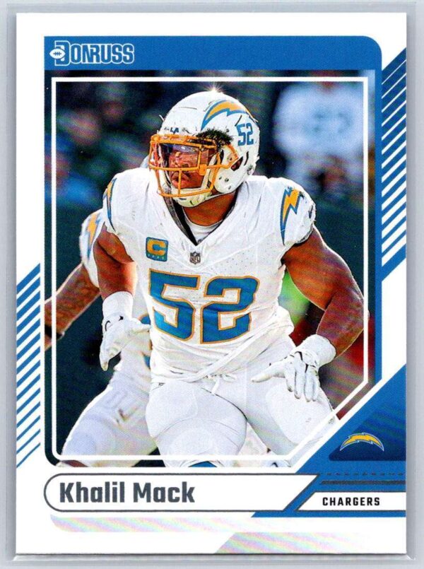 Mack’s combination of size, strength, and athleticism has earned him a reputation as one of the league’s top edge rushers. Whether it’s sacking the quarterback, forcing fumbles, or making tackles behind the line of scrimmage, Mack consistently makes his mark on the field. His leadership and experience make him an essential part of the Chargers’ defensive unit, and this Donruss card reflects his enduring impact on the game as he continues to be one of the NFL’s premier defensive talents.