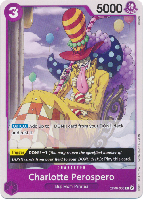 In One Piece TCG, the Charlotte Perospero card offers more than just a visual spectacle. As a character with strong defensive abilities, Perospero’s card is designed with strategic gameplay in mind, reflecting his ability to create barriers, traps, and obstacles using his candy constructs. The card’s abilities mirror his devious nature, offering players a powerful tool to control the battlefield, disrupt opponents, and manipulate the flow of the game. This makes the card not only a valuable collectible but also an essential piece for players who enjoy a more tactical and defensive playstyle. Whether used in themed decks based on the Big Mom Pirates or as part of broader strategies, Perospero’s card adds both flavor and depth to gameplay, making it a must-have for One Piece TCG enthusiasts. The design and mechanics of the card perfectly capture his essence as both a villain and a strategic mastermind, elevating it as an integral component of the One Piece TCG and a sought-after item for fans of the series.