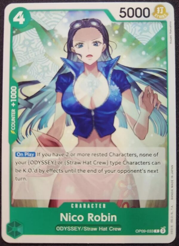 A versatile and dependable ally, Nico Robin stands as a symbol of loyalty, wisdom, and strength in the One Piece universe, making her a must-have card for any fan of the series who wishes to build a well-rounded and formidable Straw Hat crew deck. Robin’s versatility also allows her to support combos that are reliant on specific cards being played, adding an additional layer of strategic depth. Her ability to adapt to different deck types, from aggressive rush strategies to more defensive control tactics, ensures she is always a threat on the battlefield. As a powerful character and a calm strategist, Robin embodies the essence of the Straw Hat Pirates’ dynamic, making her indispensable in both the lore and gameplay.