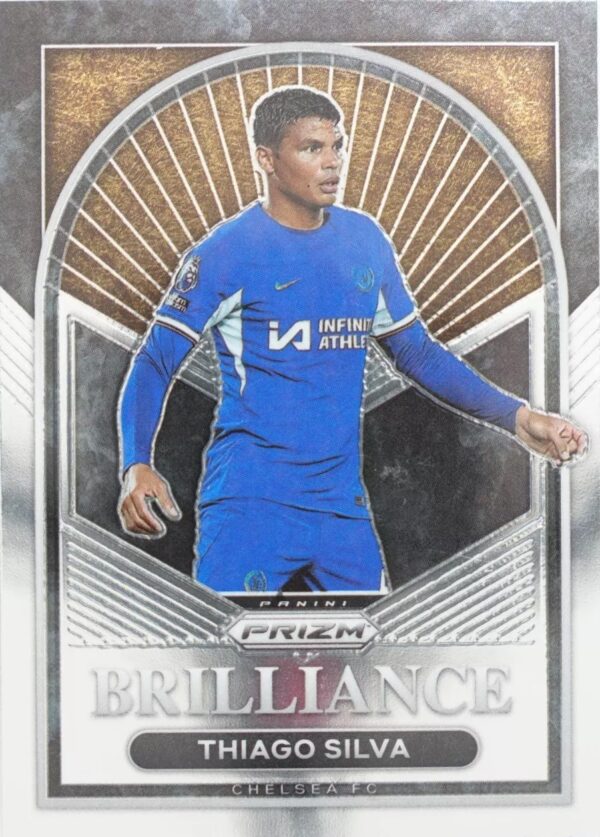 The Brilliance card is particularly noteworthy for its sharp attention to detail and premium quality. The card features a clean, well-lit image of Thiago Silva in action, showcasing the focus and concentration that have made him a key figure in Chelsea’s defense for years. The reflective surface of the card amplifies the image, giving it a dynamic and captivating appearance that makes it stand out in any collection. Collectors are drawn to this card not only for its visual appeal but also for its rarity and significance, as it highlights Silva’s unmatched experience and leadership on the field. As one of the top soccer card sets for collectors, Panini Prizm’s inclusion of Silva in their Premier League collection further elevates the card’s value. With the Brilliance insert, Panini has successfully captured the essence of Silva’s brilliance as a player and his enduring impact on the game.