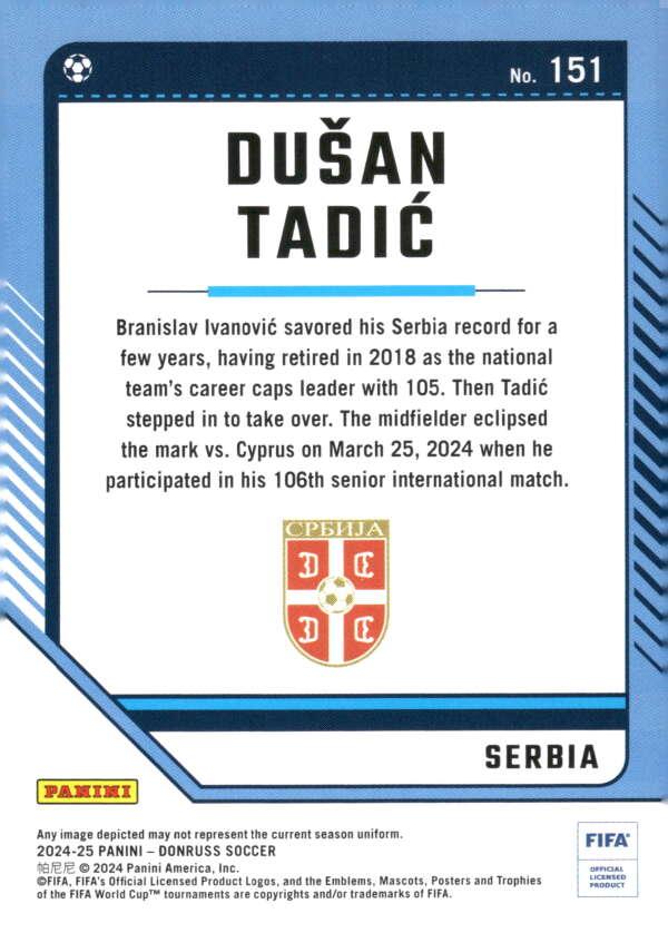 More than just a striking design, this #151 edition celebrates Tadić’s leadership and creativity on the international stage. His intelligent posture and expressive focus mirror his knack for pulling strings, combining technical elegance with seasoned composure. The card emphasizes his significance at both club and country, honoring a player who evolved from Ajax’s playmaker to Serbia’s midfield cornerstone. Perfect for collectors who value creative influence and football intelligence, this card highlights Tadić’s enduring class and Donruss’s dedication to spotlighting cerebral performers .