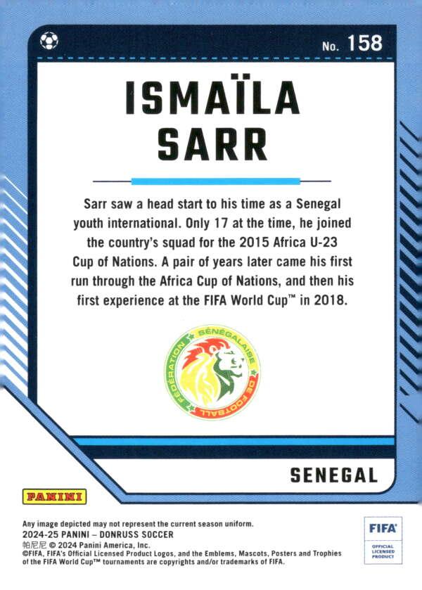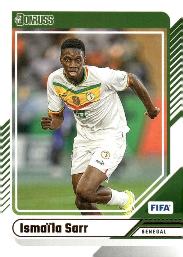 The 2024–25 Donruss Ismaïla Sarr #158 FIFA card puts Senegal’s electric winger in a dynamic attacking burst, captured as he dashes forward with the ball at his feet. Clad in the green-and-white national kit, Sarr is framed by Donruss’s crisp base design, complete with clean typography indicating his name and position. The card features a minimalist silver border that enhances its premium look, while his key attributes—pace, dribbling, shooting, and acceleration—are displayed boldly below his image, underscoring his explosive speed, deft wing play, and lethal threat in transition.
