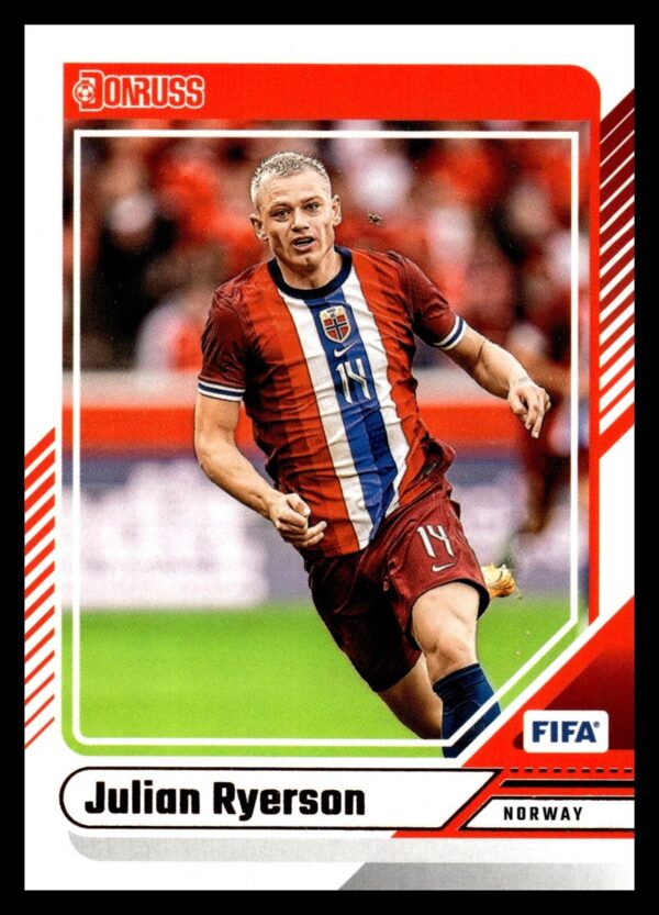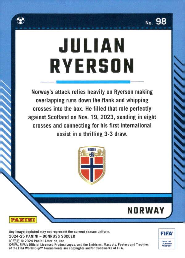 Julian Ryerson—who plays at top European clubs and regularly represents Norway—brings a combination of defensive solidity and forward aggression. His #98 card captures the essence of his game: sharp tackles, dynamic runs down the flank, and a calm presence under pressure. This release is a standout for anyone building a Norway-themed collection, Donruss FIFA base set, or showcasing modern full-backs in action.