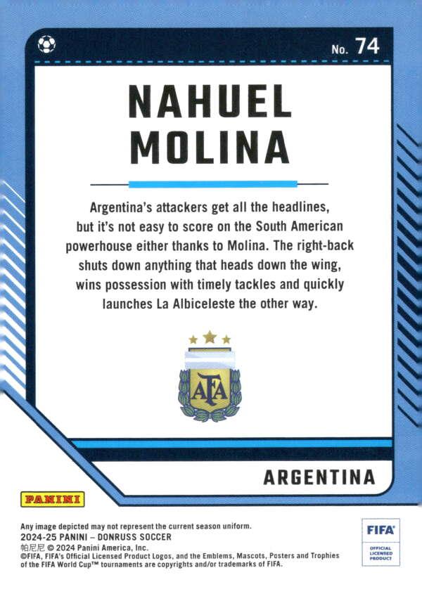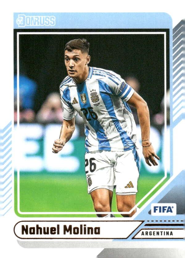 The 2024–25 Donruss FIFA #74 features Nahuel Molina decked out in Argentina’s iconic white-and-sky‑blue kit, elegantly captured in an attacking fullback moment. As part of the 175-card veteran base set, this card showcases a crisp, high-resolution action shot framed by Donruss’s modern red-and-white border, while sharp typography highlights Molina’s name, position, and national team affiliation.The design emphasizes his energetic wing-back play, with clear focus on his poised footwork and tactical movement along the flank.