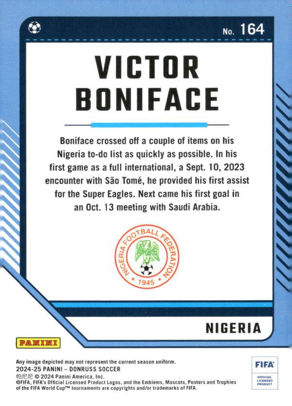 The 2024 Donruss Victor Boniface #164 card captures Nigeria’s youthful striker in a poised forward motion, either readying a strike or pressing defensively in transition. Boniface, wearing Nigeria’s vibrant green and white kit, is showcased against Donruss’s clean base design—complete with crisp typography and a subtle silver border that gives the card a polished shine. His name, number, and national crest are prominently displayed, while key attributes—pace, finishing, power, and dribbling—are clearly highlighted beneath his image, reflecting his explosiveness, lethal striking ability, and physical presence in the attack .